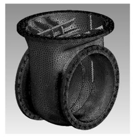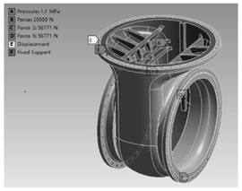 Among them, take DMN 1100 mm, bM 20 mm, qMF 3.2MPa, and calculate FM to be 225kN. The valve body is also affected by the gravity of the valve bonnet and electric fitting part, which is about 20kN. Constraints and boundary conditions are conducted for the valve body, as shown in Figure 6.
