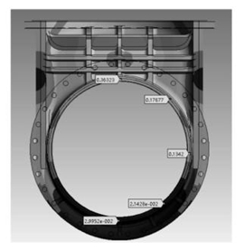 From the deformation cloud picture of the valve body, the deformation trend of the valve body's sealing surface is that the bottom deformation is the smallest, and the deformation gradually increases along the sealing surface. The maximum deformation on the sealing surface is 0.363 mm, and the minimum deformation is about 0.030 mm; the deformation in the middle is about 0.134 mm. The calculation results of the finite element conform to the actual working conditions of the valve body. When the deformation at the sealing surface of the valve body is greater than 0.001DN, the valve will leak due to excessive deformation of the valve body, because the maximum deformation of the valve body's sealing surface is less than 0.001 DN. Therefore, the valve body's structural design is reasonable.